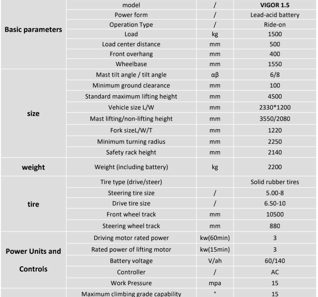 TYPHON VIGOR 1.5 Compact Electric Forklift Key Specifications