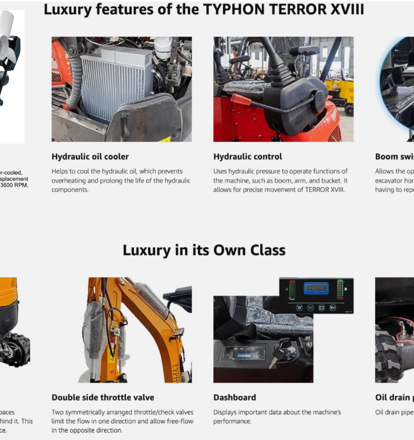 Introducing the TYPHON LUX Mini Excavator, a pinnacle of luxury and efficiency in excavation. Crafted by USA Excavator, this excavator is not just a machine; it’s a statement. With a focus on flexibility, ease of transport, and superior heat dissipation, the TYPHON LUX is your go-to solution for a wide range of applications, including planting, digging, applying fertilizer, and weeding in orchards. Let’s delve into the key features that make the TYPHON LUX stand out.